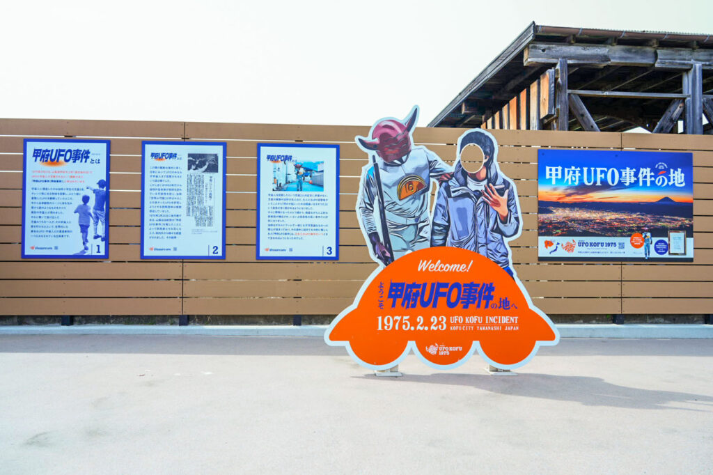 発生から50周年を迎え、目撃現場には記念の看板やユニークな顔出しパネルも設置されています。