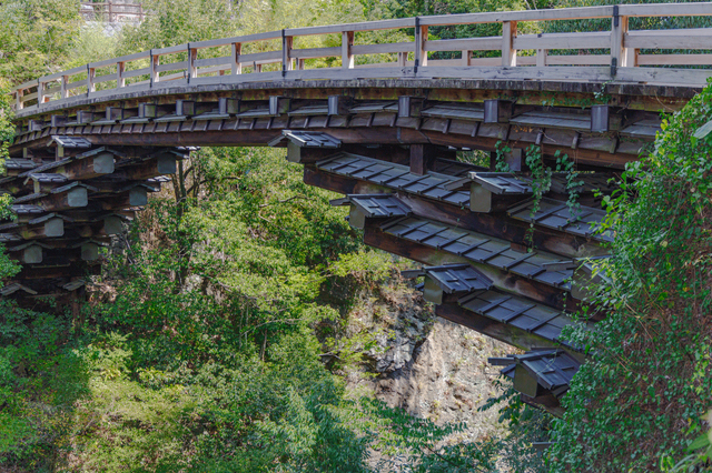 柱を使わず、両岸から張り出した四層の「はね木」だけで支えているという、珍しい構造となっています。