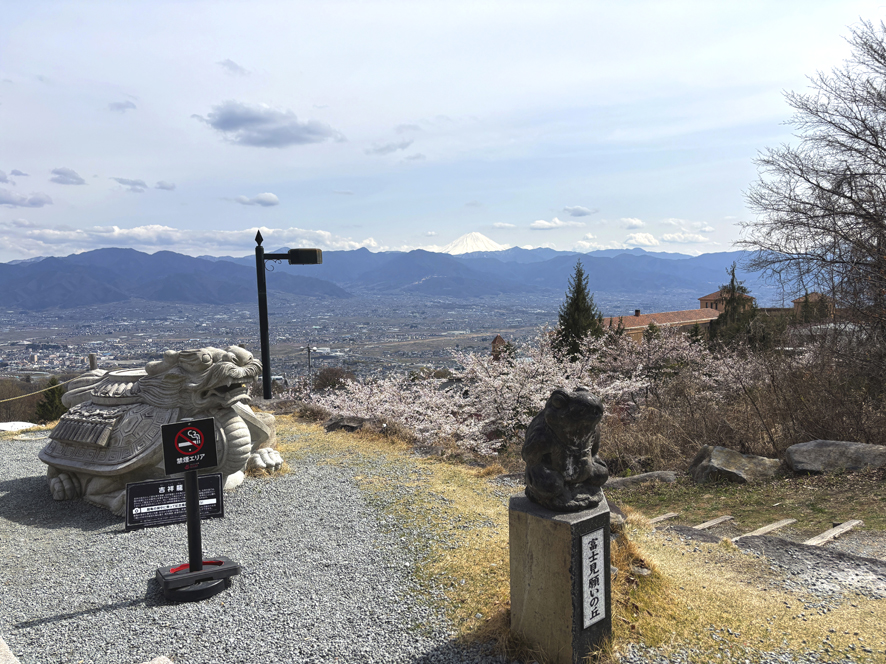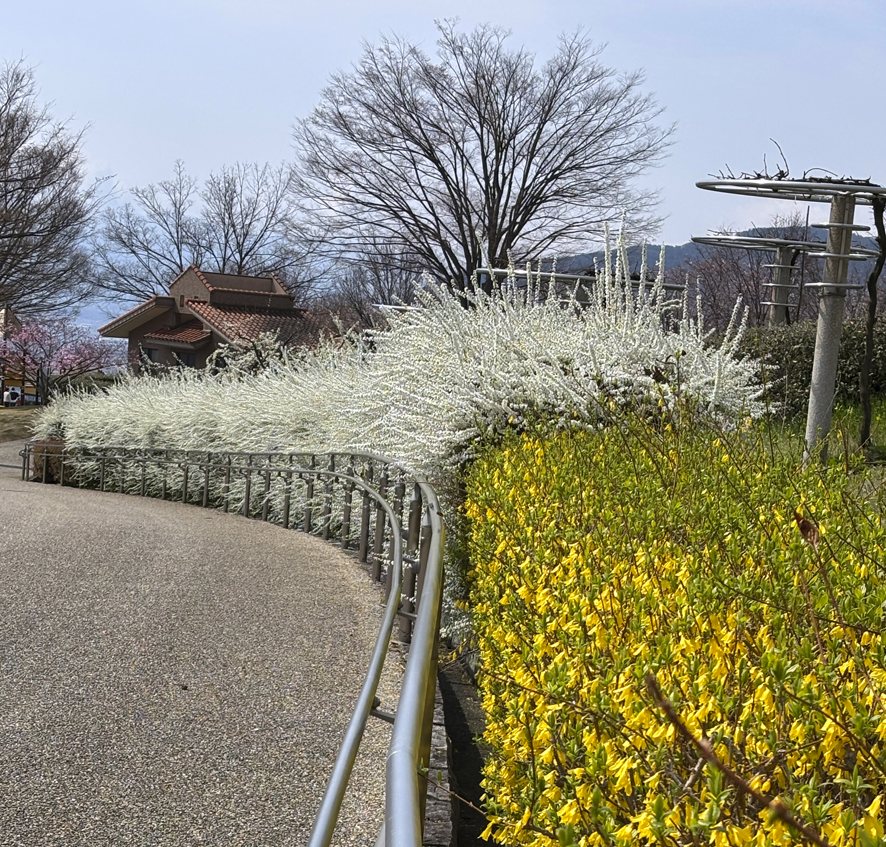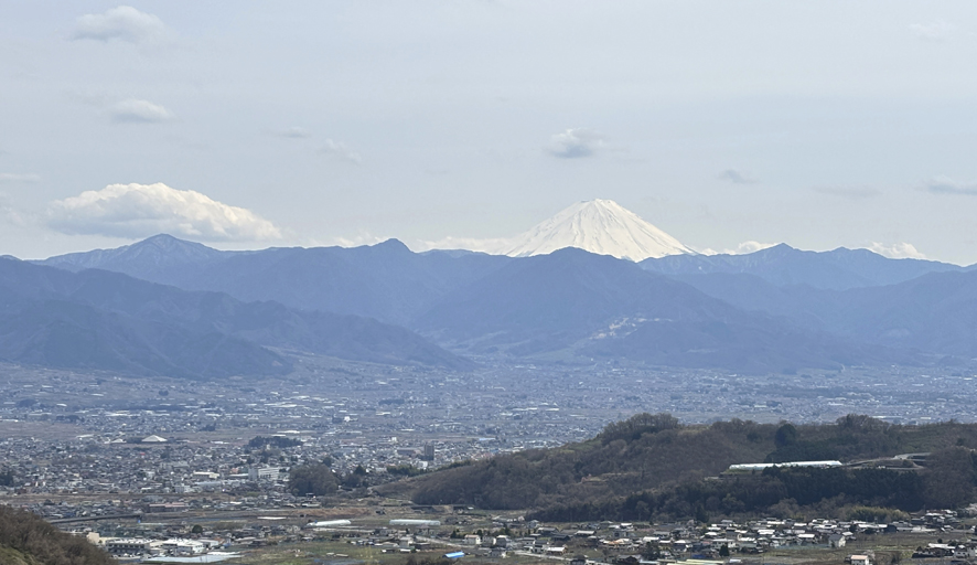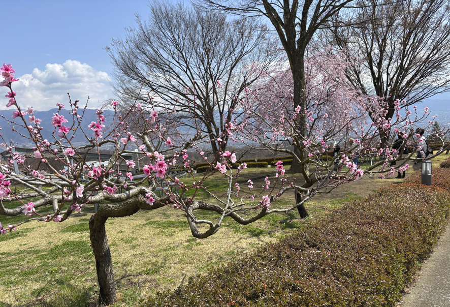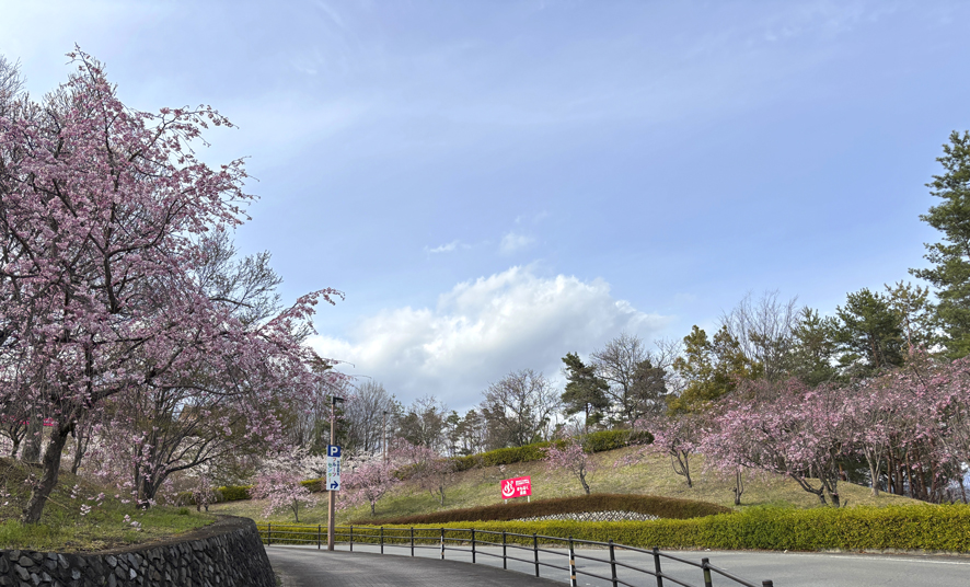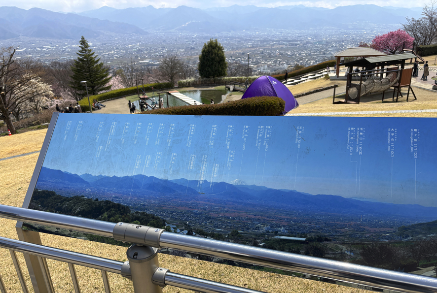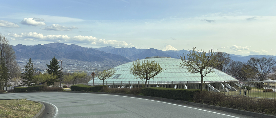 そろそろ峡東地域を代表するメジャーな観光スポットへ行ってみますか。この季節、フルーツ公園は花盛り。園内も周辺も色とりどりの花々に囲まれ、雄大な富士山や周辺の山々が一望できる広々とした場所にいるだけでも、リフレッシュできる。