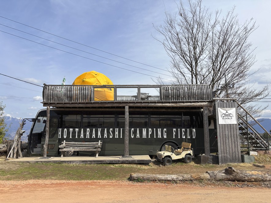 ほったらかし温泉のすぐ奥にあるキャンプ場。富士山と甲府盆地の絶景が楽しめる。ショップエリアには休憩スペースのバスにはなぜか鹿の運転手が!宙に浮くロードバイクがあったり、遊び心とセンスにあふれワクワク感がとまらない。場内にはカフェや、フォトスポットの「どこでもドア」があるので、キャンプをしなくても行ってみると楽しいかも。
