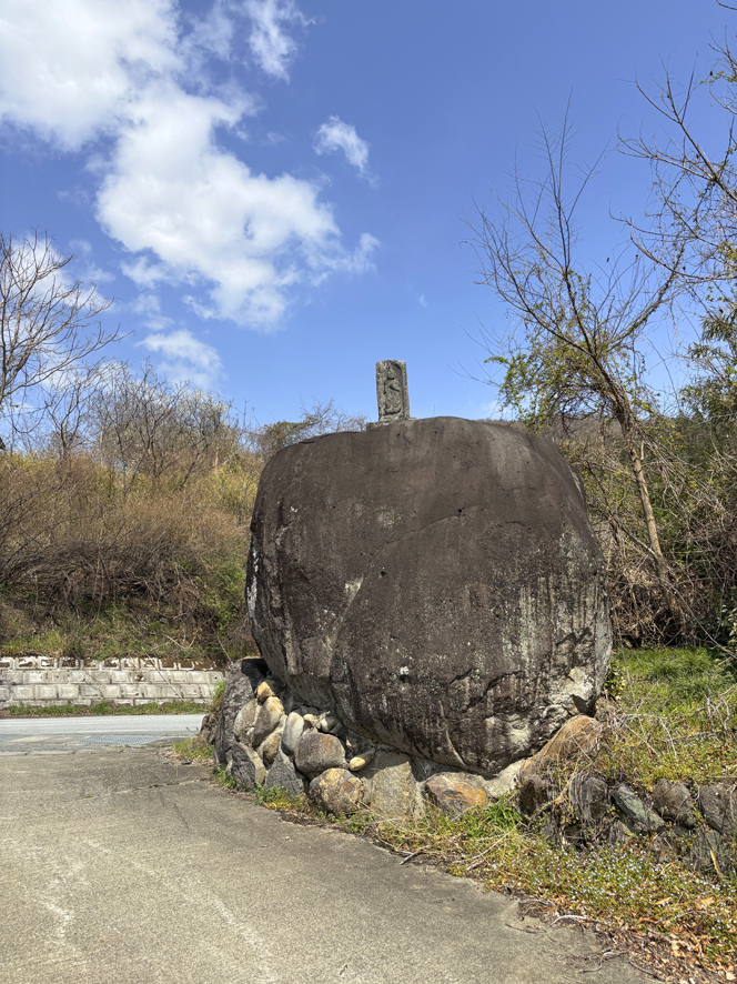 フルーツラインを牧丘方面に向かう途中、道の傍らに不思議な石碑がある。注意しないと見逃してしまう。平均的な日本女性の身長を優に越える大きな丸い石の上にちょこんと乗った石碑がなんともユニークで愛らしい。