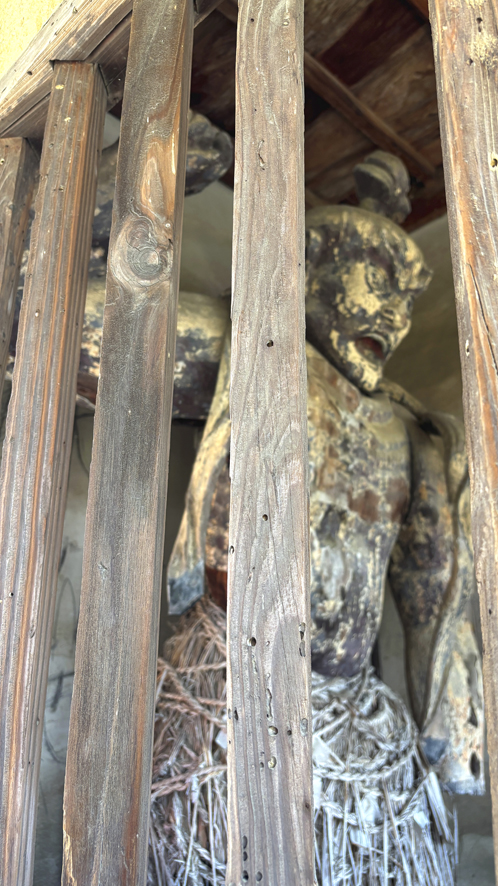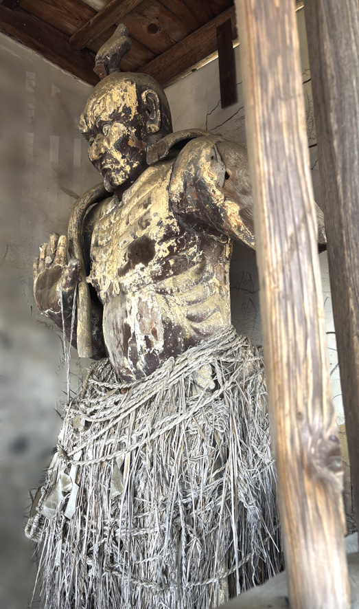 ナビに導かれ細~い道を進むと、石段と仁王門が見えてきた。門の左手を車でぐるりと奥へ回り、本堂の傍に駐車。徒歩で石段の下へ戻り、改めて上り直すと阿吽(あうん)の仁王像がにらみをきかせている。壁の落書きは見なかったことにしよう。