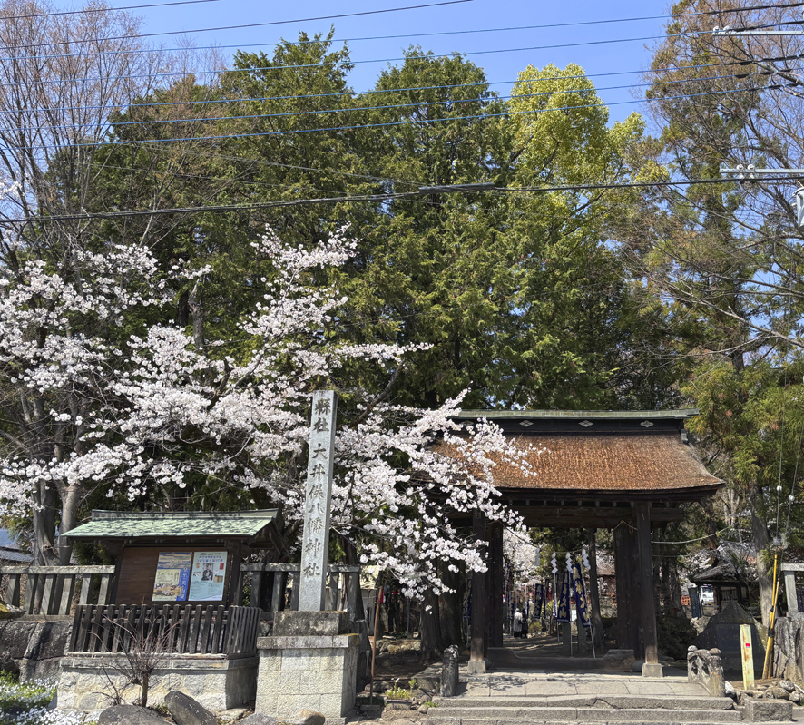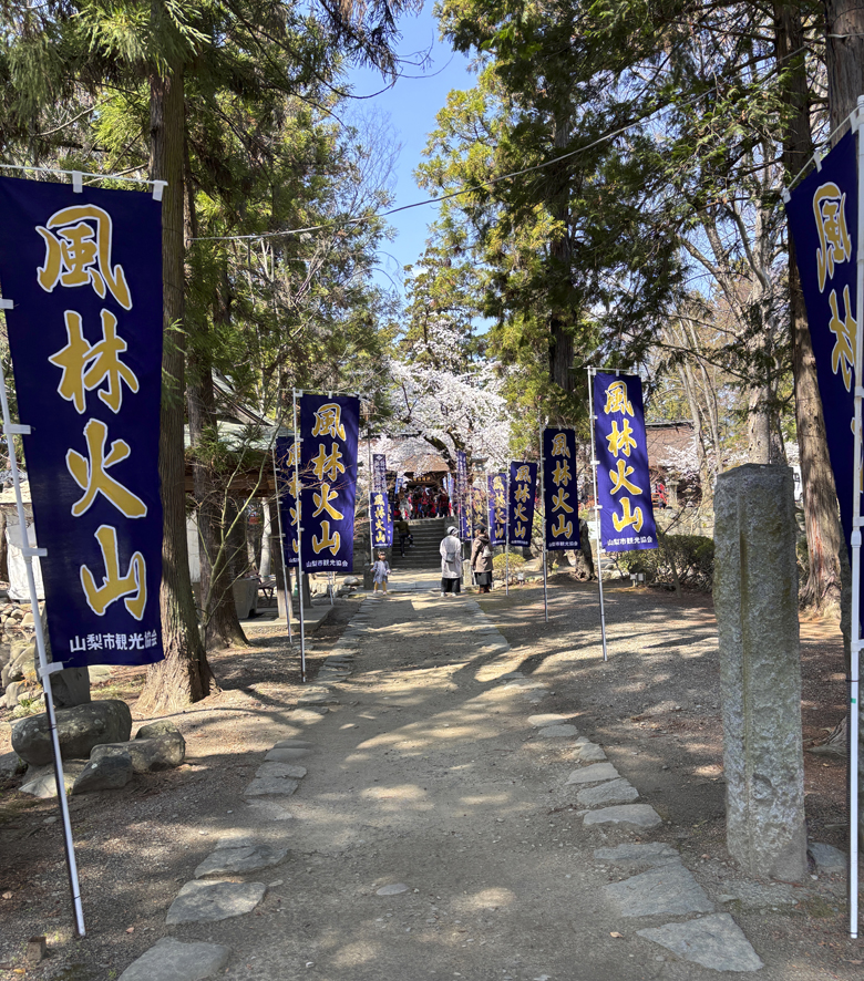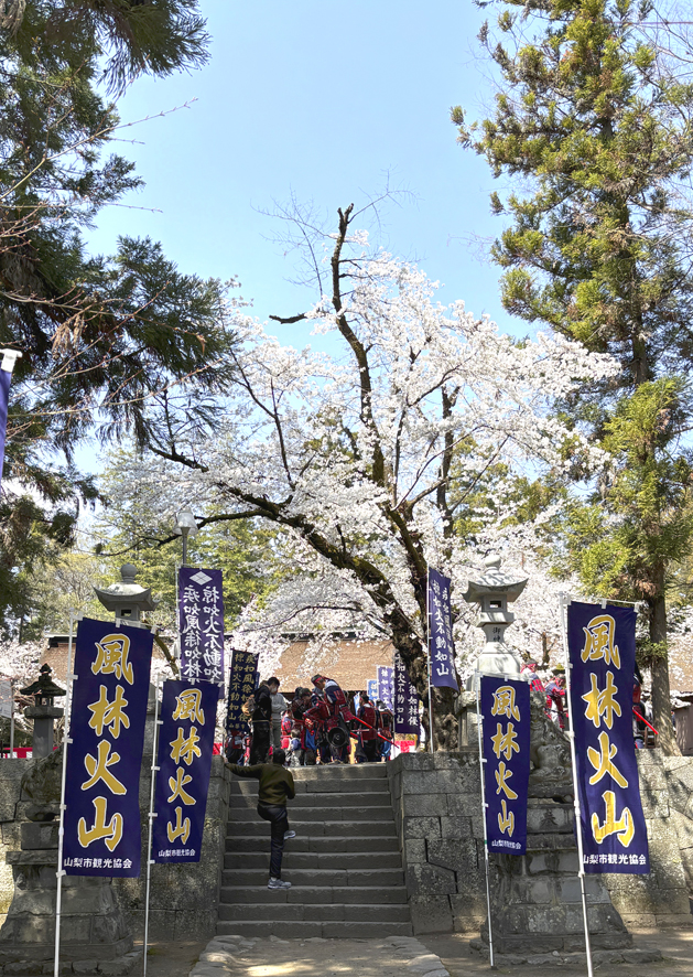 神社を目指し車を走らせると、大きな鳥居の先に風林火山ののぼり旗と賑やかな人だかりが見える。鎧甲冑に身を包んだ人たちがなにやら準備中の様子。アトで知ったのだが信玄公まつりの出陣式を控えた真田弾正忠隆隊がゆるーく談笑していた時間帯だったようだ。思いがけず舞台裏を目撃してしまったことになる。本番ではこの山梨市隊、勇ましく「えいえいおー」と出陣したんだろうなぁ。