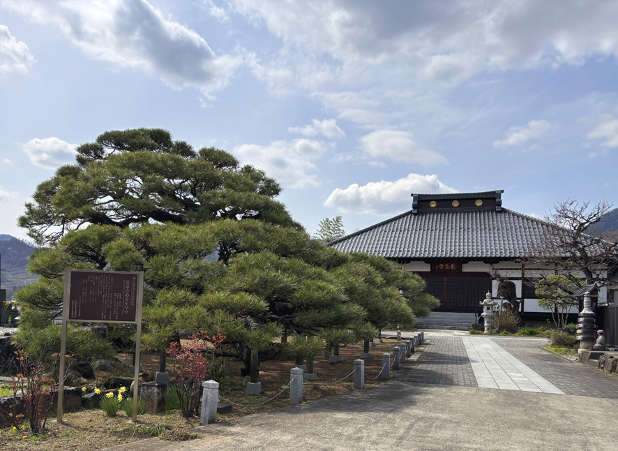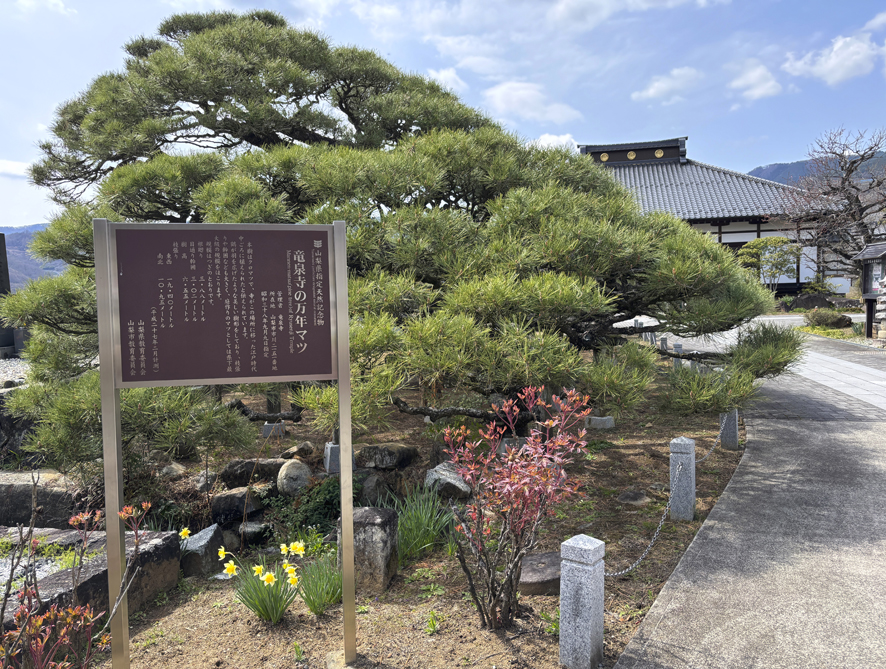 「万年マツ」の看板を頼りに目的地へ。なるほどこれが山梨市の誇る県下最大級の松(庭作りの松としては)ならではの風格というものか。江戸時代中頃に植えられた(と伝えられている)というから驚きだ。「枝振りが…」とか「根の張りが…」とかマツの鑑賞ポイントも知らないシロウトの感想としては素直に「立派で見事で美しい」で良いですか。